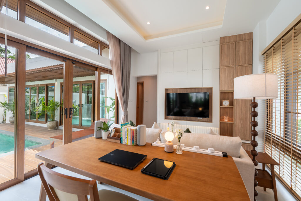 A coffee corner and a dedicated workspace are integrated into the living area supporting a lifestyle where residents can work, relax and spend extended time in the villa comfortably.